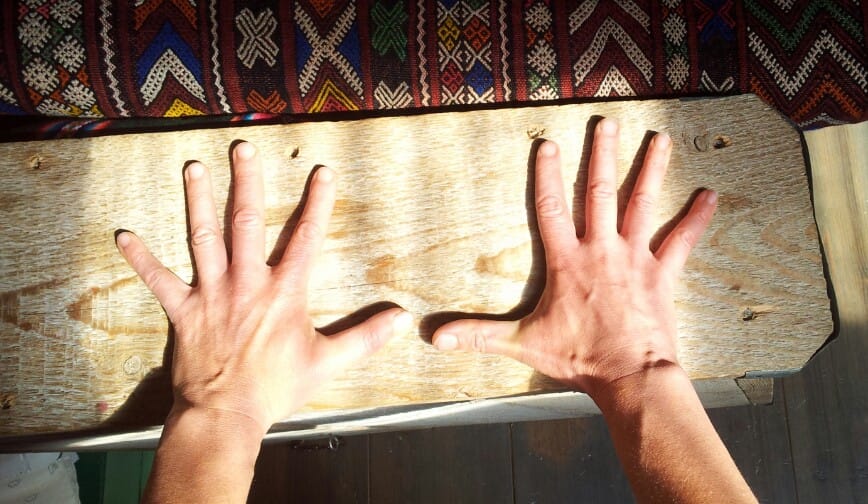 We beginnen meteen met een testje: ga aan tafel zitten en strek je armen voor je uit. Leg je handen op tafel. Kijk naar je handen en zie of je je duim en wijsvinger in een hoek van 90 graden kunt brengen ten opzichte van elkaar. Zo dus: